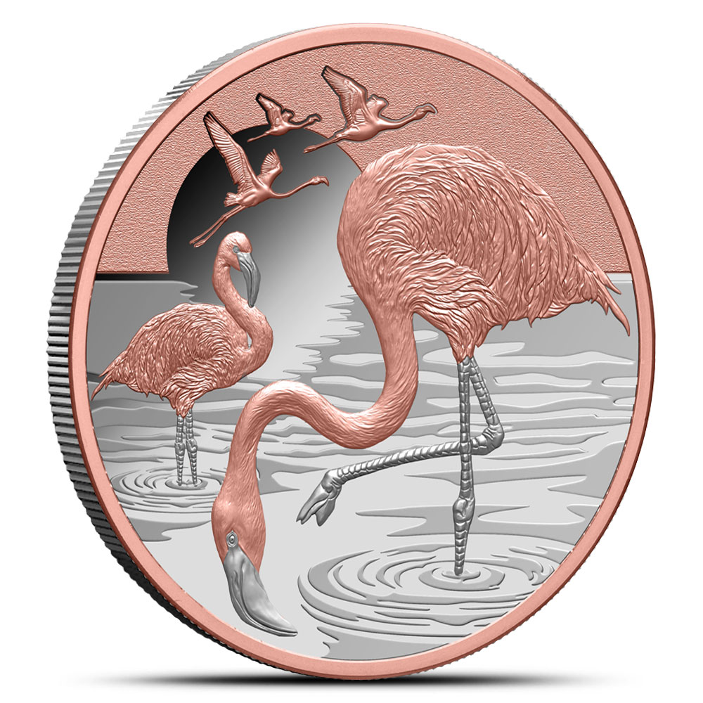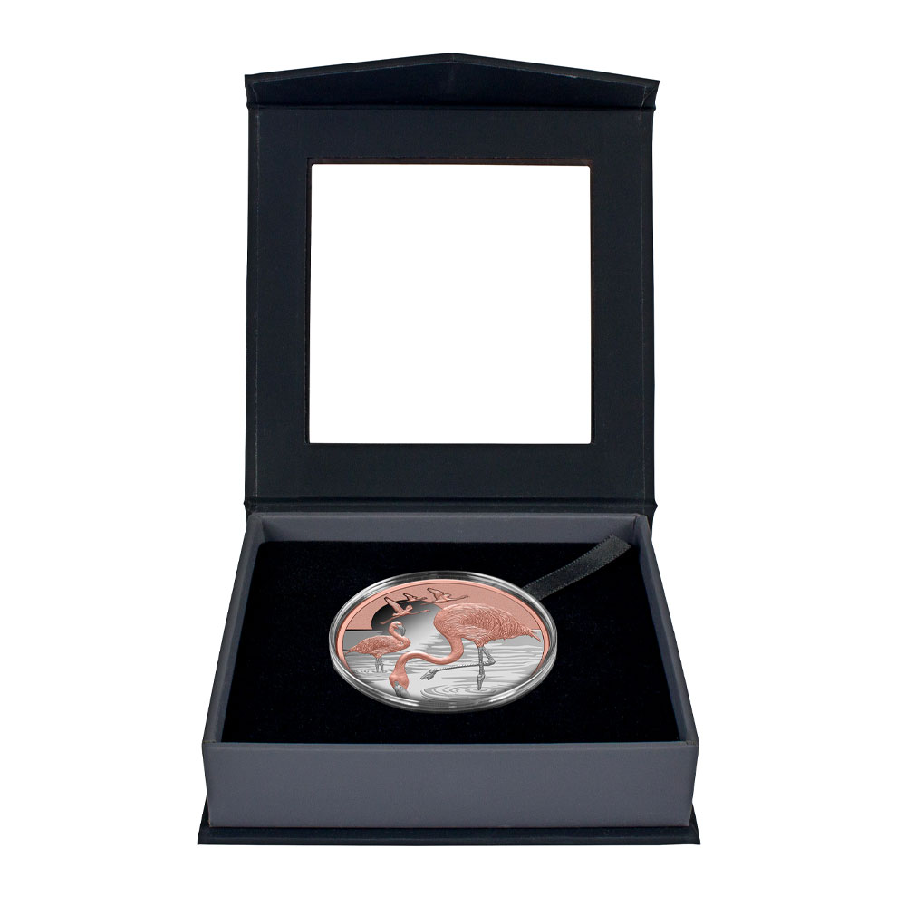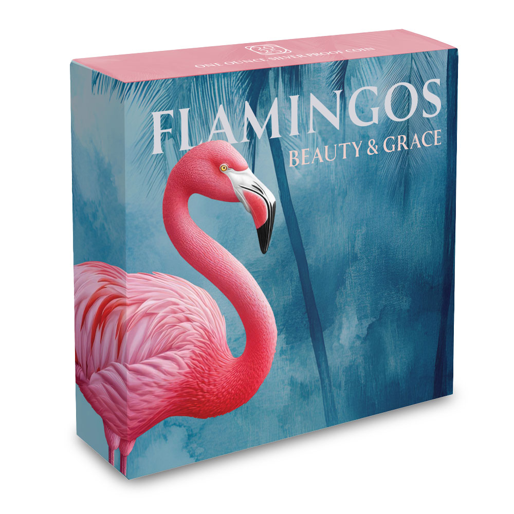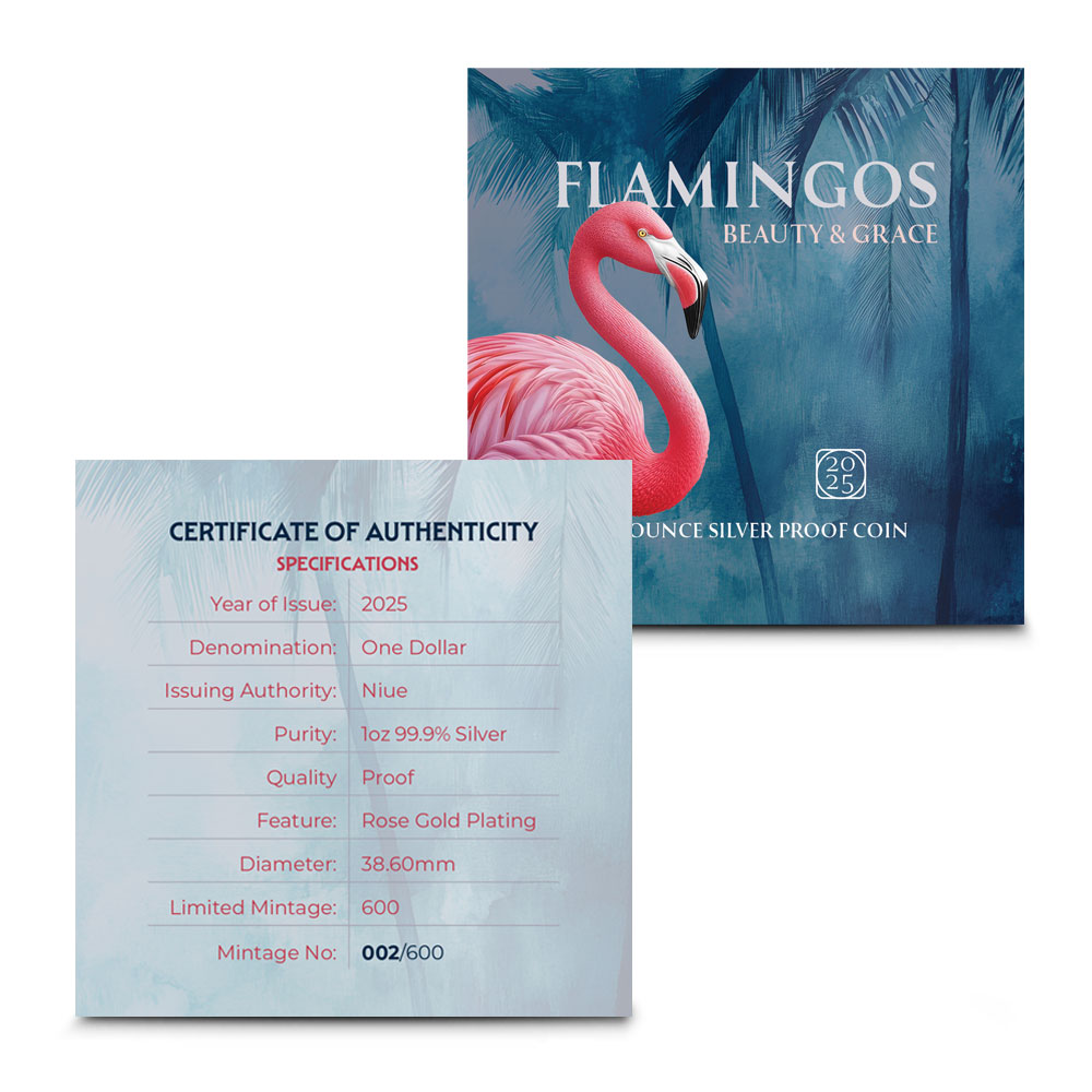 Each 2025 1 oz Niue Proof Silver Beauty and Grace Pink Flamingo Coin arrives in a presentation box and includes a Certificate of Authenticity. The coin is also packaged in a colorful, flamingo-themed shipper. Select elements of the reverse design are accented with rose-gold plating, and the proof visuals highlight the details with frosted designs set against mirrored backgrounds.