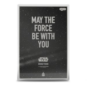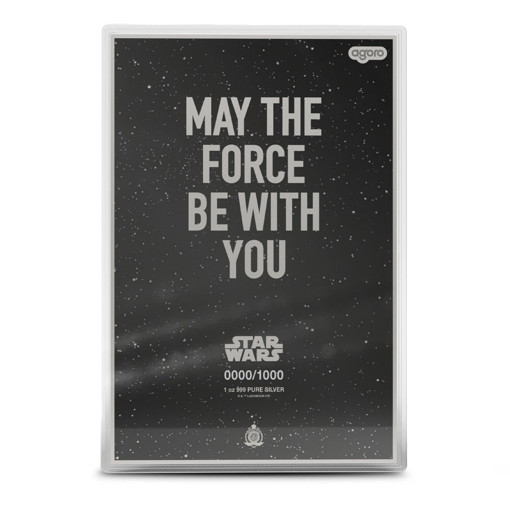 The obverse of the 2025 Proof Colorized Niue Silver Star Wars A New Hope Foil Coin includes the phrase MAY THE FORCE BE WITH YOU at the center. The Public Seal of Niue appears at the bottom of the field, and a unique serial number from 0001/1000 through 1000/1000 is located on the bottom of each individual piece.