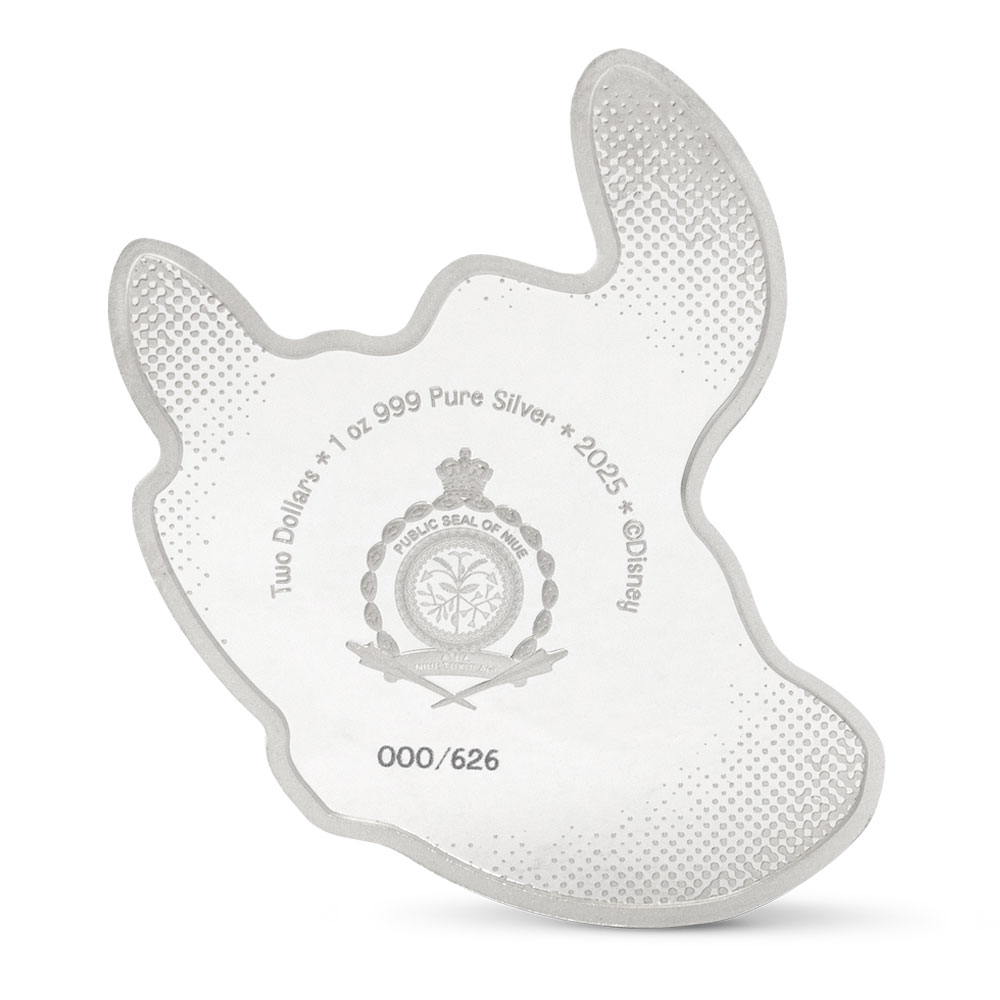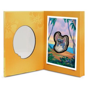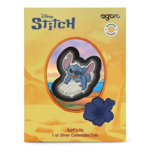 Each 2025 1 oz Proof Colorized Niue Silver Stitch Surf’s Up Coin comes in a box designed just for this release, featuring Stitch-themed artwork. A Certificate of Authenticity is also included. The coin itself is shaped, with a polished proof finish that includes frosted details and full-color artwork on the reverse.