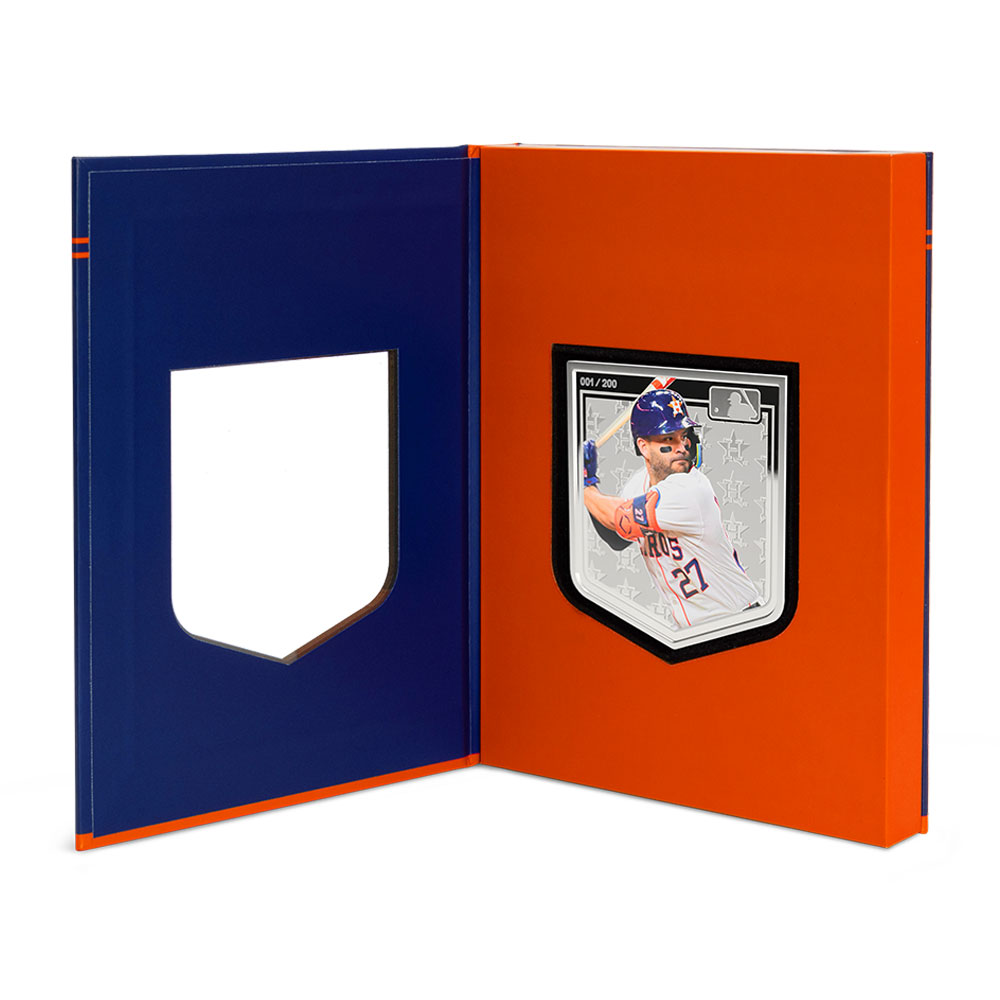 Each 2025 3 oz Proof Colorized Niue Silver Major League Baseball Jose Altuve Coin comes with its own presentation box and Certificate of Authenticity. A unique serial number is included on the reverse, and the reverse also showcases a vivid colorized design. Both sides of the coin feature proof finishes, with frosted design elements set against mirrored backgrounds.