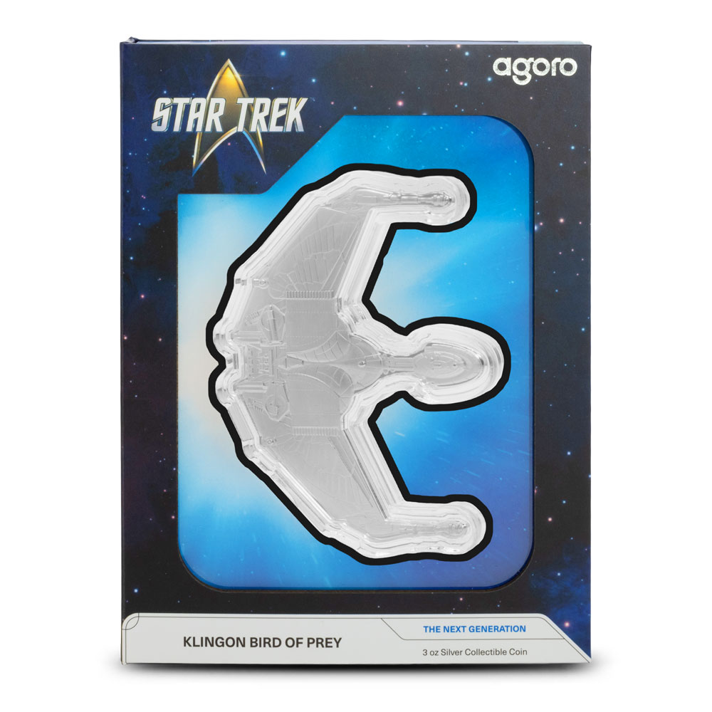 Each 2025 3 oz Proof Niue Silver Star Trek Ships Klingon Bird of Prey Coin is packaged in a display box and includes a Certificate of Authenticity from the issuing mint. The proof finish uses frosted design details with polished backgrounds, highlighting the ship’s features in sharp contrast.