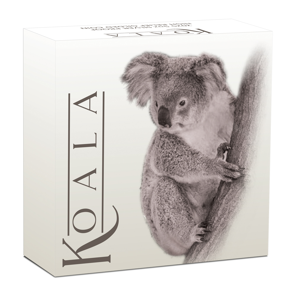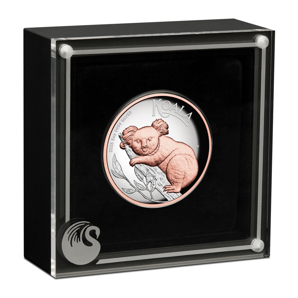 Each 2025 5 oz Proof Australian Silver Koala Coin comes in a Perth Mint presentation case with a black base and clear acrylic lid. The coin is packaged in a themed Koala shipper and includes a Certificate of Authenticity. With its high-relief design, the coin’s details are brought out against a deeper field. Select areas of the coin, including the rim and the koala on the reverse, are highlighted with 24-karat gold.