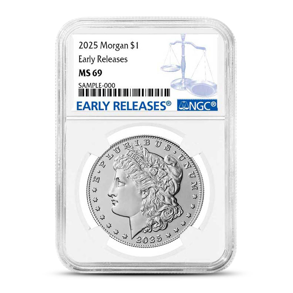 Each 2025 Morgan Silver Dollar Coin offered here is graded Mint State 69 and comes in a sealed plastic holder. MS69 coins are near-perfect with original mint luster and only very small flaws. These imperfections are limited to light marks or lines and are usually found outside the main focus areas. “Early Release” coins are those that reached the grading service within 30 days of the mint’s release.