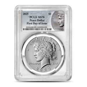 Each 2025 Peace Silver Dollar available here is graded Mint State 70. This means it’s in flawless condition, featuring complete mint luster and no noticeable imperfections. The First Day of Issue label is given to coins submitted for grading within 24 hours of their release by the mint.