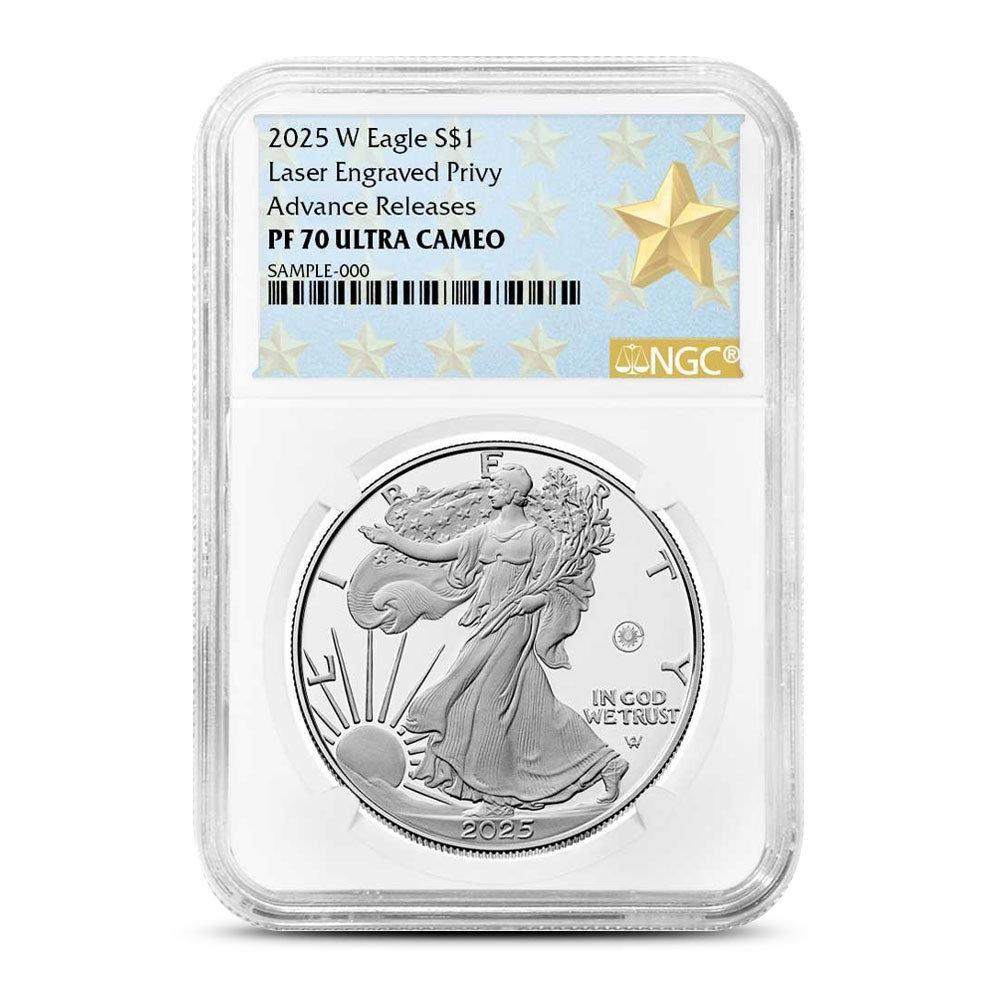 All 2025-W 1 oz Proof Laser Beam Privy American Silver Eagle Coins offered here are certified in perfect condition. PF70 coins display full, original mint luster and no visible flaws. The UCAM (ultra-cameo) label notes strong, frosted design elements over deeply mirrored fields. Advanced Release indicates coins distributed by the Mint ahead of the general public release window.