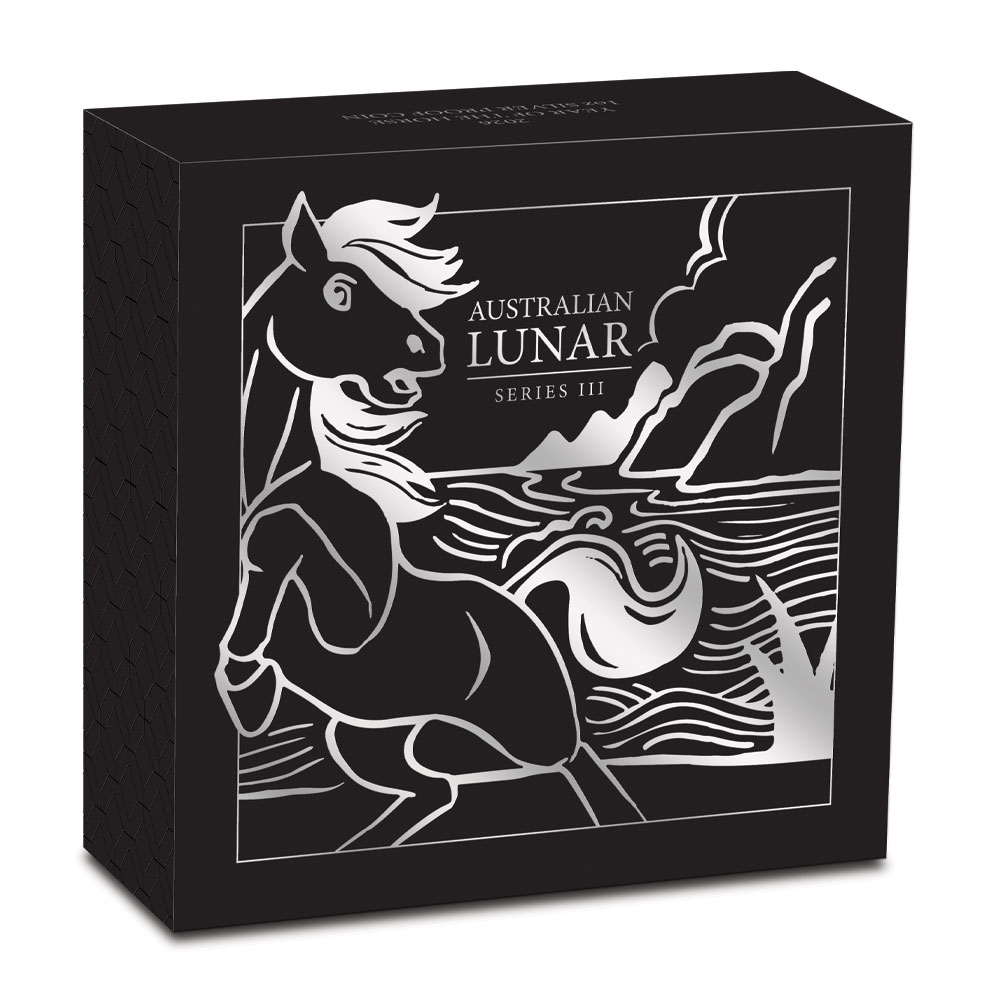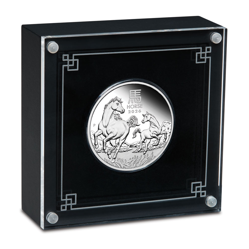 Each 2026 1 oz Proof Australian Silver Lunar Horse Coin comes inside a stylish Perth Mint display case. The black case includes a clear, acrylic lid and comes packaged in a Lunar Horse-themed outer shipper. Every coin also arrives with its own Certificate of Authenticity.