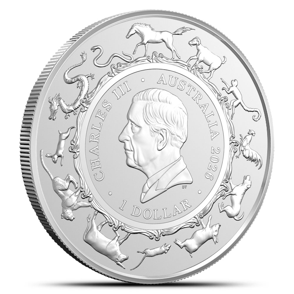 King Charles III appears on the obverse of the 2026 Royal Australian Mint Silver Year of the Horse Coins. His left-facing effigy is centered within the field, surrounded by the ring of zodiac animals mentioned above.