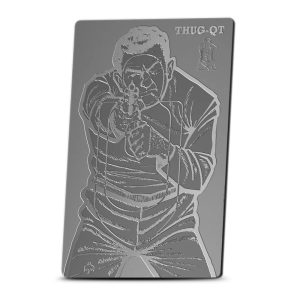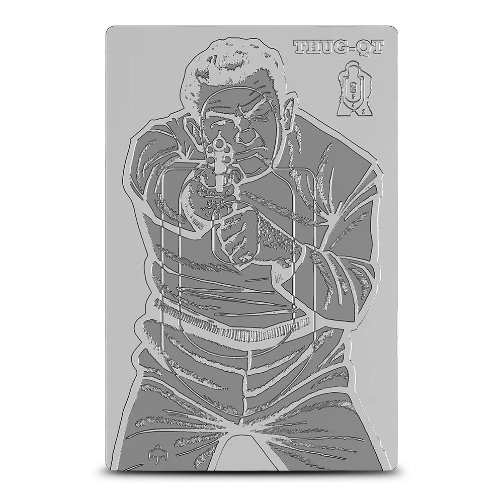 Here at BullionMax, we’re excited to share a design inspired by classic training targets used since the early 1900s. Over time, these targets moved from simple shapes to human outlines to help shooters focus on center mass and key areas. This rectangular silver coin showcases the THUG-QT sheet with a silhouetted, armed figure—now offered as the 2026 2 oz Proof Niue Silver THUG-QT Coin at BullionMax.