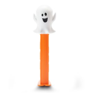 The Ghost PEZ dispenser in this set has an orange base topped with a cheerful white ghost. Over time, Halloween ghosts have shifted from spooky and scary to playful and friendly figures. This change came about through cartoons, books, and the growing Halloween industry, which made these characters fun for kids instead of frightening.