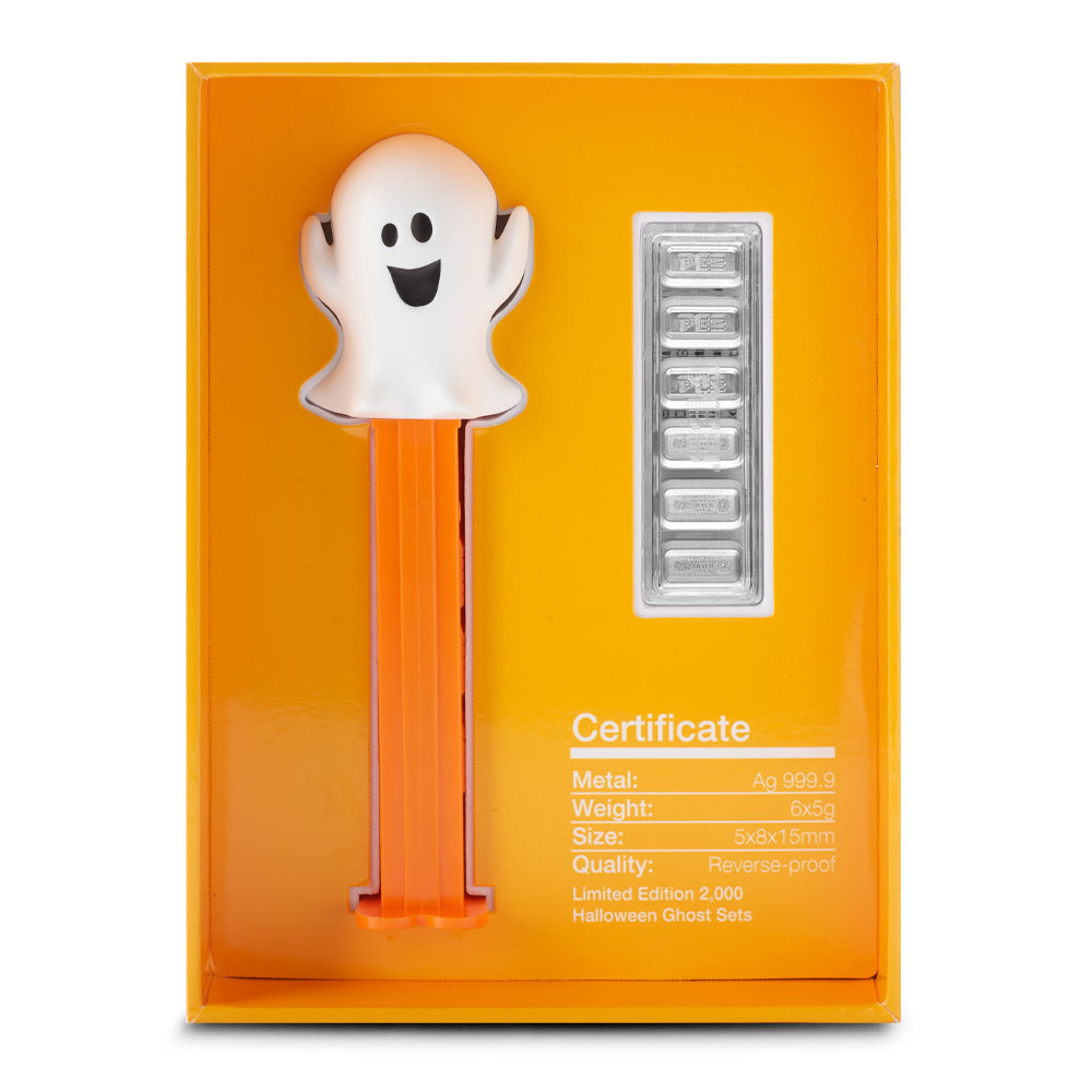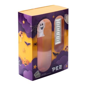 Each set comes packaged in a Halloween-themed gift box with a clear viewing window. The silver wafers are safely sealed inside a capsule, and the Ghost PEZ dispenser is included empty. You can keep the wafers in the capsule for display or place them inside the dispenser for a unique look.